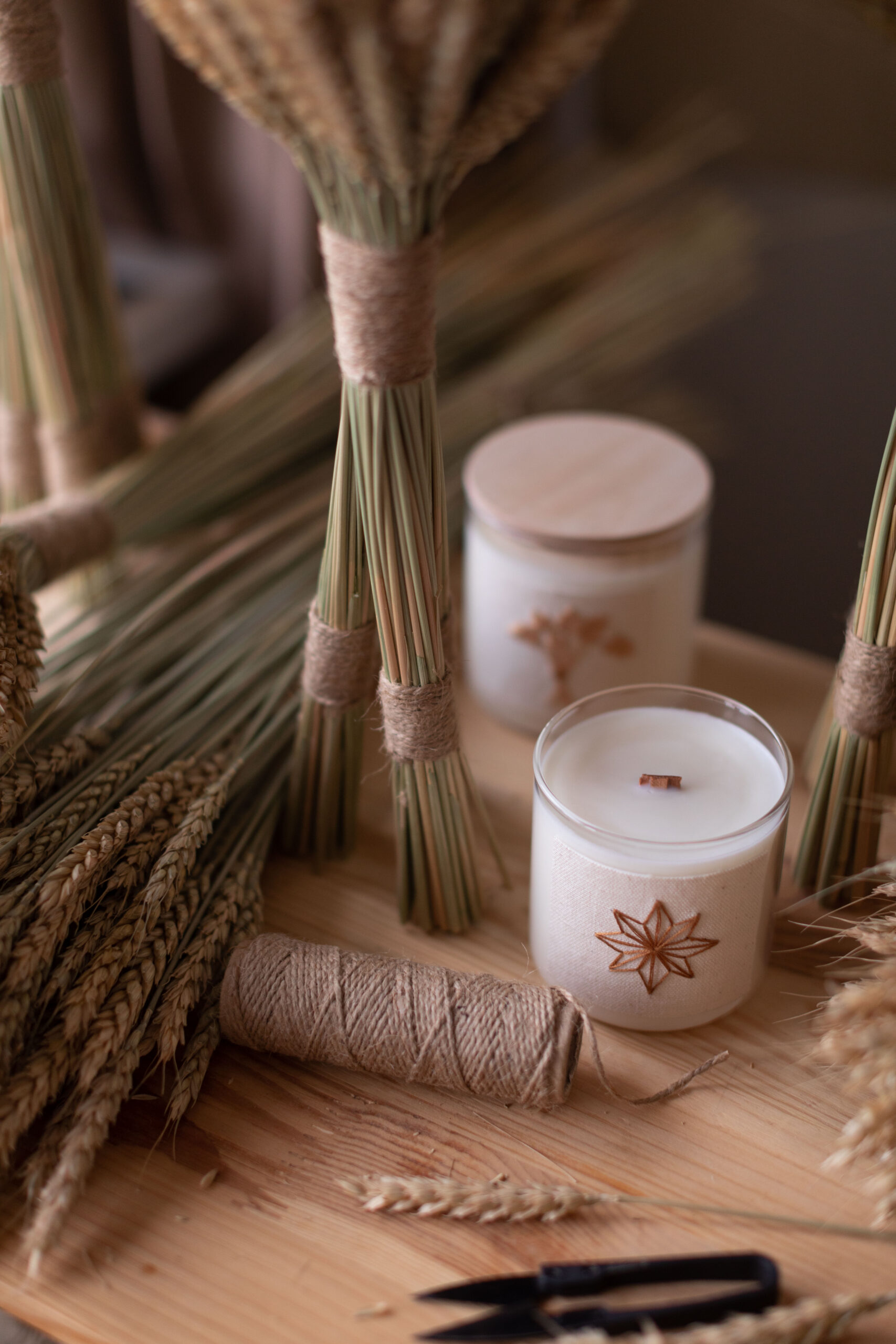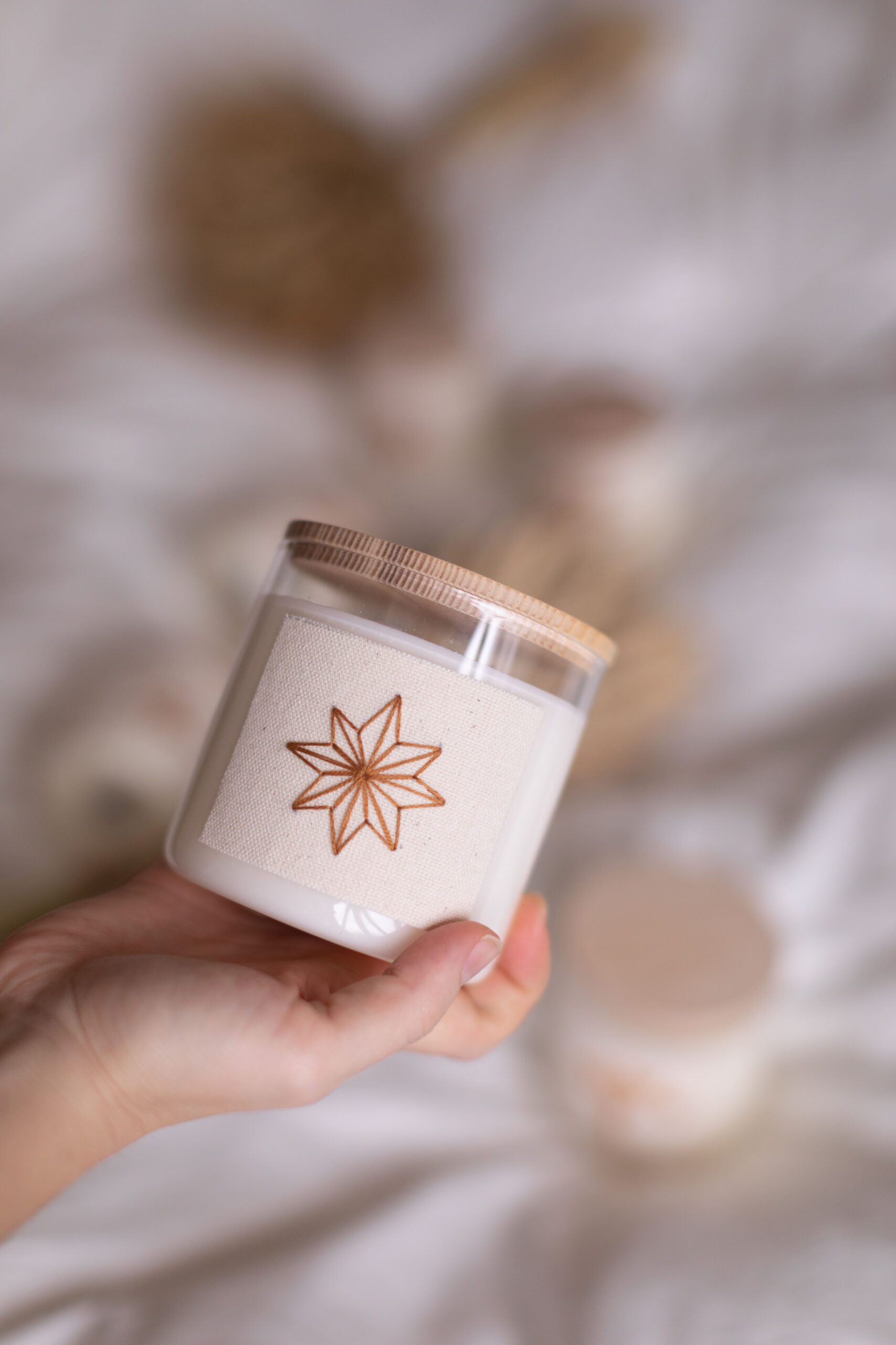Соєва свічка ручної роботи, кожна етикетка містить ручну вишивку восьмипроменевої зірки.